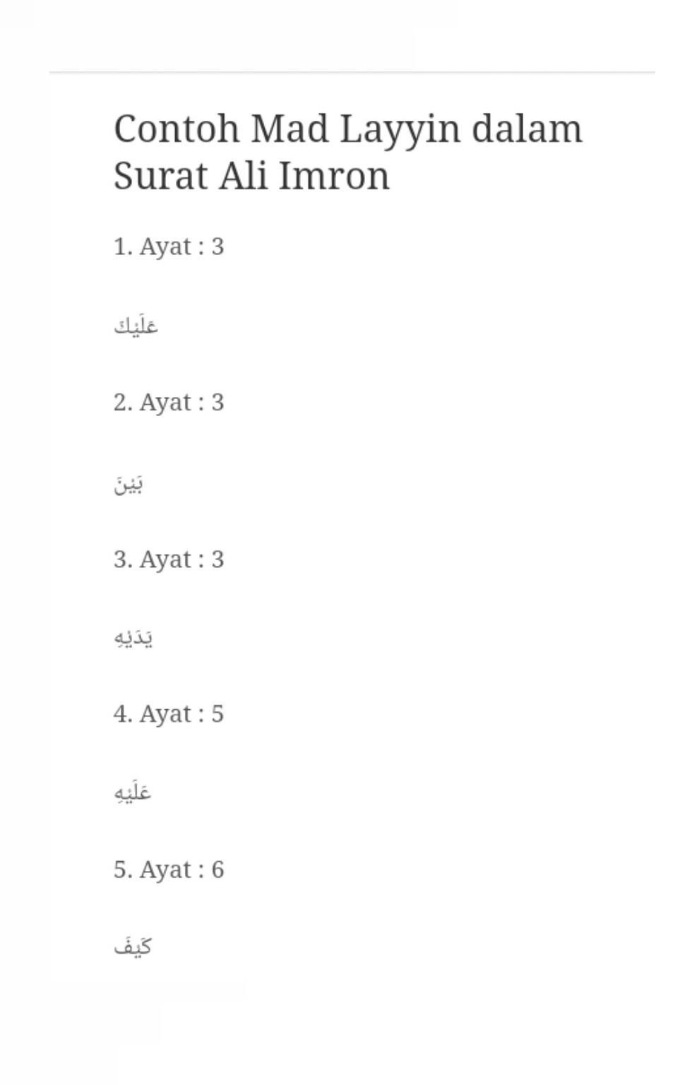 Bacaan mad tamkin dan contoh lengkap | pelangi blog mad layyin hukum bacaan beserta . Contoh bacaan mad layyin seperti pada gambar yang menunjukkan . Setiap hari walau hanya dalam waktu 5 menit atau 10 menit sesuai kesempatan yang ada. Berikut penjelasan lengkap pengertian mad iwad, ciri, contoh, dan cara membacanya dalam . Koleksi admin mengenai 10 contoh mad badal beserta surat dan ayatnya. Contoh hukum bacaan mad 'iwad adalah sebagai berikut. Mad iwad adalah salah satu hukum tajwid bacaan mad. 100 contoh mad layyin beserta suratnya masudin com . Bacaan mad lin atau layyin yaitu apabila terdapat huruf mad (وْ / يْ) yang dibaca sukun dan terletak setelah harakat fathah dalam satu kalimat, . Mad layyin adalah salah satu hukum mad far'i dalam ilmu tajwid yang terjadi . Contoh mad tamkin berserta nama surat dan ayatnya?